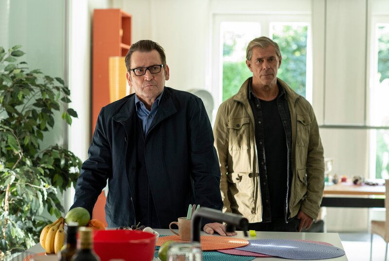 • Beim Ehepaar Tuchmann erfahren die Kommissare Lars Engeln (Ingo Naujoks, l.) und Finn Kiesewetter (Sven Martinek, r.) Details über das Mordopfer.