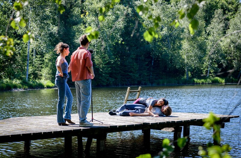 • Leo (Aurel Klug, rechts unten) irritiert es, wie sehr Elias (Orlando Lenzen, 2.v.r.) die Liebes-Scharade mit Lale (Yeliz Simsek, links oben) pusht.