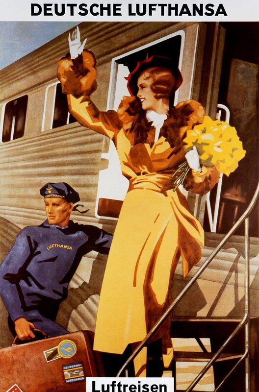 • In den frühen 1930er Jahren warben Plakate mit "Luftboys" – jungen Helfern oder Stewards in schicker Uniform – für die moderne und prestigeträchtige Lufthansa.