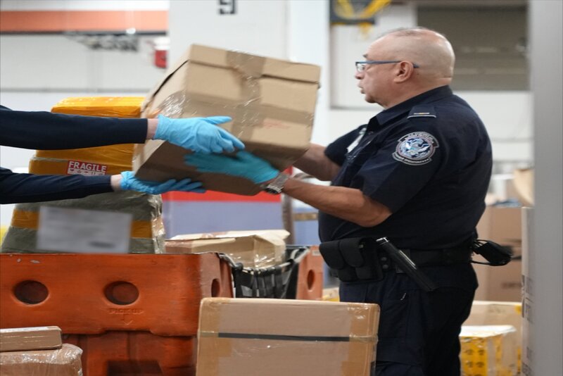 CBP-Beamter Cisneros übergibt ein versandtes Paket an einen anderen CBP-Beamten am JFK International Airport.