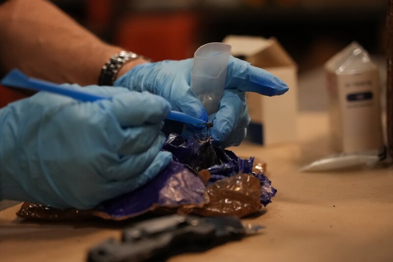 Ein CBP-Beamter untersucht eine Mohnkapsel, die in einer Lieferung gefunden wurde. (National Geographic)