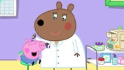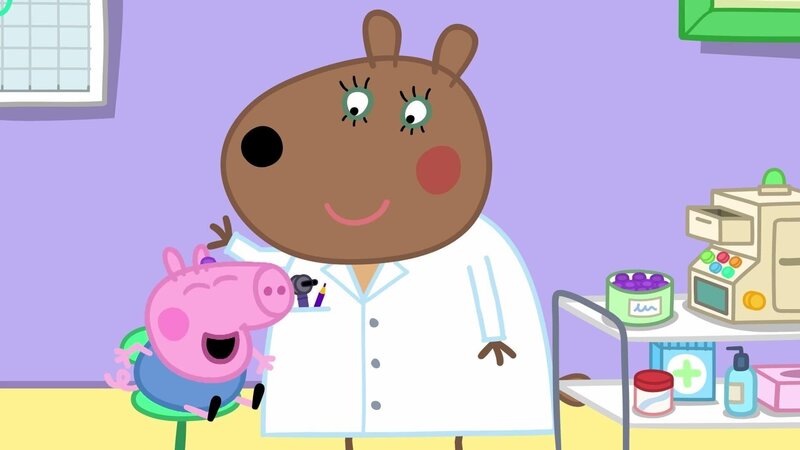 Evie wird von einer Ohrenärztin untersucht und hört prima. Schorschs Hörvermögen hat sich verschlechtert, was seine Eltern beunruhigt. Ein Hörgerät hilft ihm, besser zu hören, und er lacht begeistert über sein eigenes lautes Lachen.