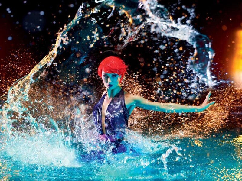 • Eine Sängerin fesselt das Publikum im blauen Licht der Palastbühne.