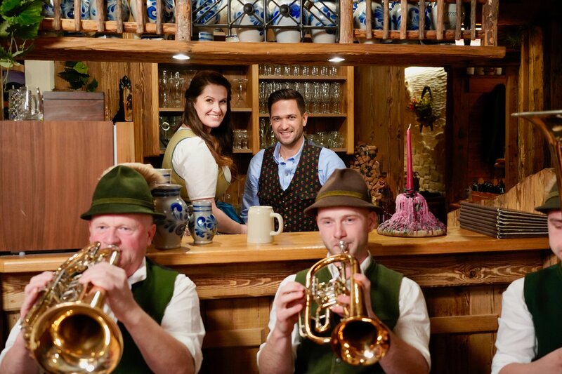 ServusTV Moderatoren Conny Bürgler und Richard Deutinger (hinten), Musikanten des Wolfganger Viergsang (vorne), in der Stube der Mostschänke Hussenbauer.