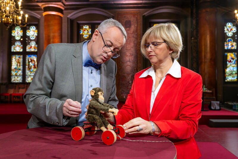 Die Experten für Spielzeug: Mathias Ernst und Anke Wendl mit einem Spielzeugaffen auf einer Draisine.