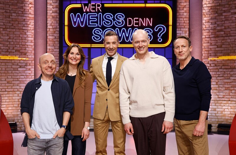 Moderator Kai Pflaume (M.) und seine Rateteam-Kapitäne Bernhard Hoëcker (l.) und Wotan Wilke Möhring (r.) begrüßen in dieser Sendung die Rennrodlerin und Olympiasiegerin Julia Taubitz (2.v.l.) und den Rennrodler und Olympiasieger Max Langenhan (2.v.r.).Bild: © ARD/NDR/UFA SHOW & FACTUAL/Morris Mac Matzen