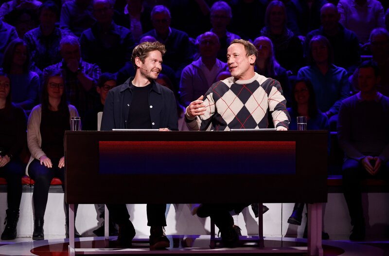 Rateteam-Kapitän Wotan Wilke Möhring (r.) mit dem Kriminalbeamten vom Landeskriminalamt Bayern, Oberkommissar Fabian Puchelt (l.).Bild: © ARD/NDR/UFA SHOW & FACTUAL/Morris Mac Matzen