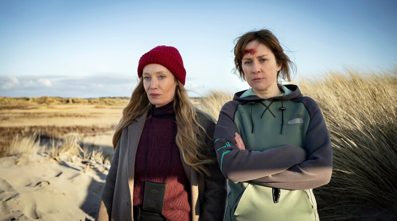 Kommissarin Frida Olsen (Katharina Heyer, li.) und die verletzte Polizistin Ida Sörensen (Marlene Morreis, re.) am Tatort in den Dünen.