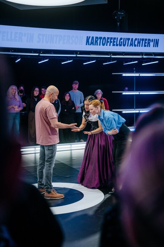 Parshad Esmaeili (M.) und Karoline Herfurth (r.) spielen in "Neo Match up" gegeneinander und müssen die Berufe der Kandidaten und Kanditatinnen erraten.