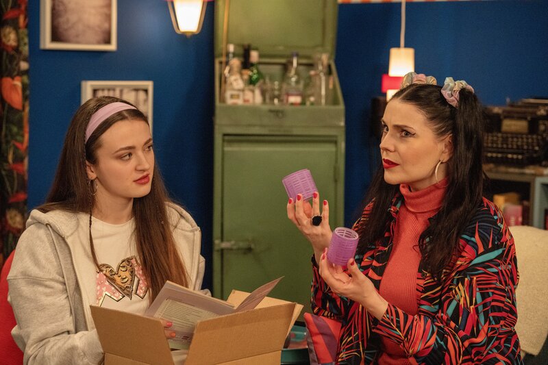 Von rechts: Tina (Anita Eichhorn) nimmt Majas (Godiva Adela) Angebot an, als Produkttesterin für Lockenwickler einzuspringen.