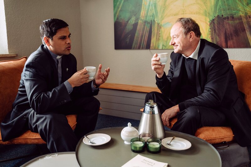 Pfarrer Burman (Daniel Popat, links) versucht, mit dem Generalvikar (Pfarrer Reiner Maria Schießler, rechts) eine Lösung für sein Waisenhaus in Indien zu finden.