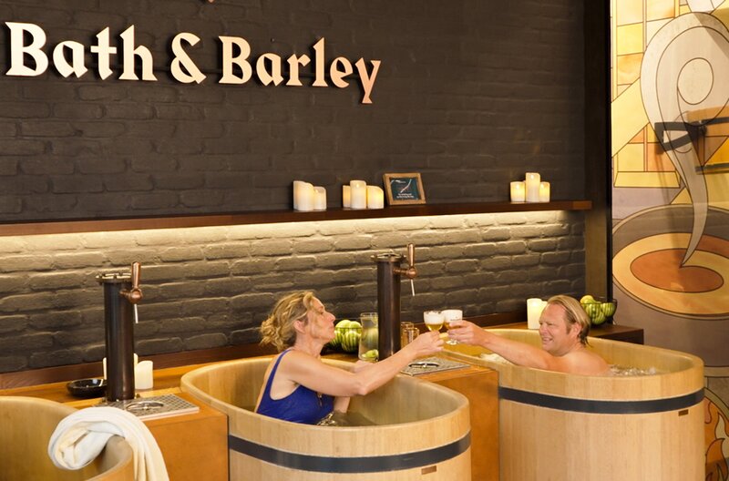 Spa mal anders: Björn Freitag und Tamina Kallert entspannen im traditionellen Bierbad im Bier-Spa “Bath & Barley” in Brüssel – frisch gezapftes Bier inklusive.