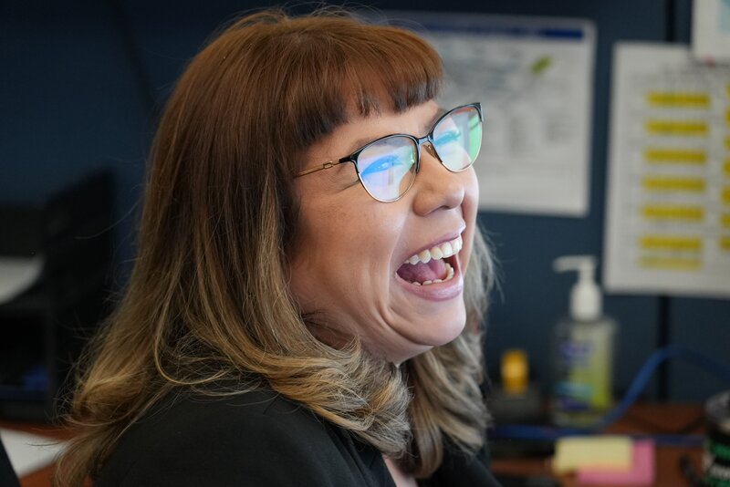 • Julie, Assistentin des Aufsichtsprogramms, lacht im Fundbüro des Flughafens LAX.