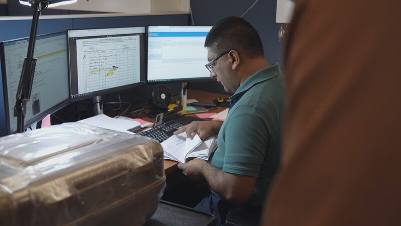 • Edward sortiert Unterlagen für einen Bericht über ein verschwundenes künstliches Auge.