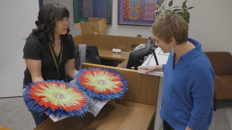 Melissa und Dr. Alexandra betrachten indigene Insignien. (Quelle: National Geographic)