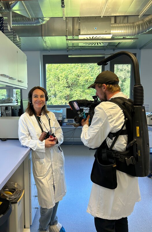 Autorin Ulrike Reiß und Kameramann Marcus Zahn bei Dreharbeiten im Universitätsklinikum Augsburg.