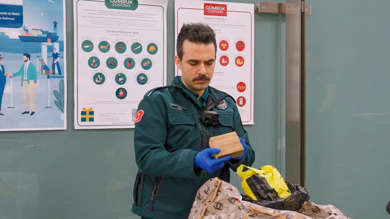 Beamte der Zollfahndung stehen am Flughafen in Istanbul bereit, um die Passagiere einer Maschine aus Kolumbien zu kontrollieren. Dabei geraten ein junger Mann in einem blauen Trainingsanzug und seine weibliche Begleitung ins Visier der Grenzschützer. Die vielen Länderstempel im Pass des Reisenden weisen ein Muster auf: Er reist etwa alle zwei Tage in ein anderes Land. Das ist höchst verdächtig. Und bei einer Gepäckkontrolle kommen aus einem schwarzen Beutel ein Fläschchen und verpackte Lebensmittel zum Vorschein. Ein unangenehmer Geruch breitet sich aus.