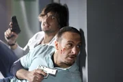 • Als Colani (Emilio De Marchi, hinten) und Pezzoni (Luca Maric, 2.v.l.) mit ihren Männern und den Geiseln Hanna (Olga von Luckwald, l.) und Wagner (Stephan Bieker, 2.v.r.) aus dem Versteck kommen, werden sie von den Kommissaren überrascht und eröffnen sofort das Feuer... (M. und r. Komparsen)