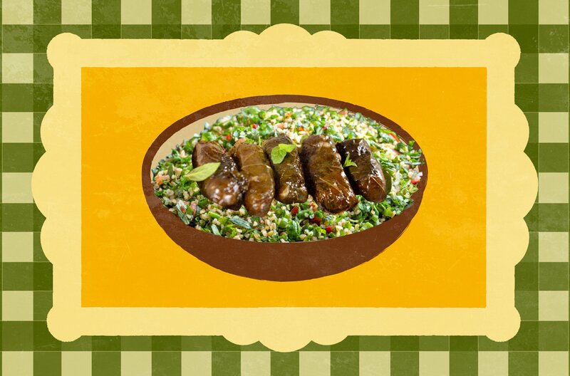 Libanesische Mezze mit den orientalischen Klassikern Taboulé, dem Auberginenpüree Mutabbal und gefüllten Weinblättern