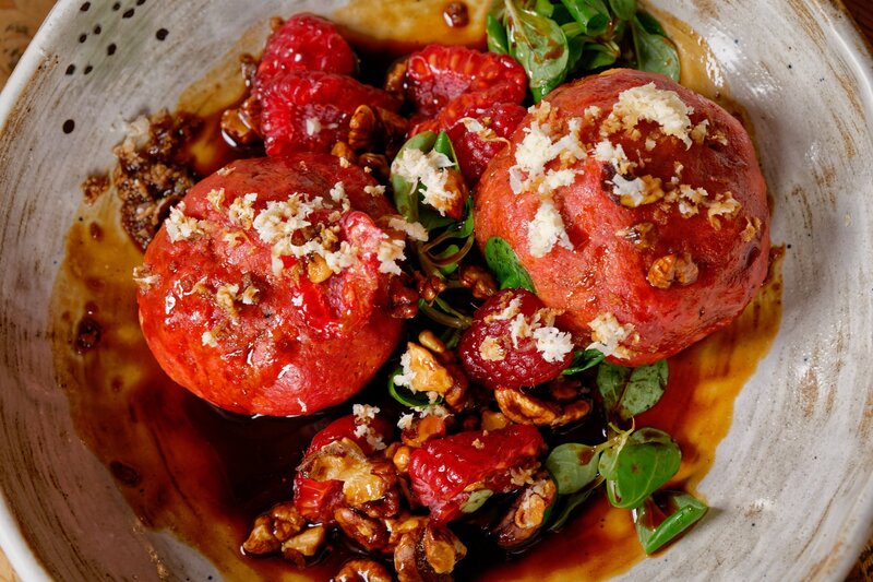 „Gedämpfte rote Rüben-Knödel mit Aberseer Schafkäse, Walnüssen und Himbeer-Nussbutter-Vinaigrette“ von Josef Schöndorfer, Gasthof Wiesenhof.
