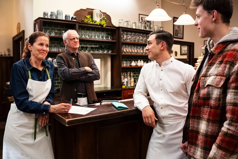 • Als Leons und Hackis Finte nach hinten losgeht, lässt sich Joseph selbstsicher darauf ein, die Abendschicht in Jugendsprache zu führen. Von links: Annalena (Heidrun Gärtner), Joseph (Michael Vogtmann), Leon (Joel Akgün) und Hacki (Timo Baran, KLD).