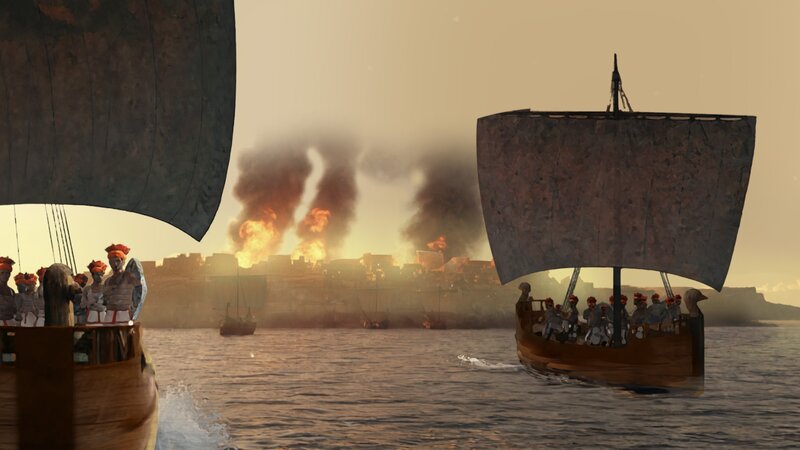 Die Seevölker (von denen Historiker annehmen, dass sie zu den Philistern wurden) fliehen nach dem Angriff auf eine Stadt auf Booten. (Windfall Films Ltd)