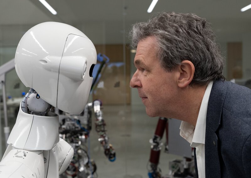 Uwe Spetzger, Neurochirurg und Professor am Karlsruher Institut für Technologie (KIT), Auge in Auge mit einem humanoiden Roboter des KIT