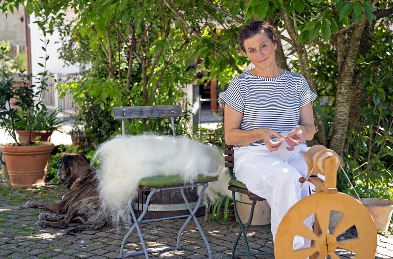 • Außer dem Fleisch und den Fellen wird auch die Wolle der Schafe genutzt: Gisela spinnt Produkte, die sie im eigenen Hofladen verkauft.