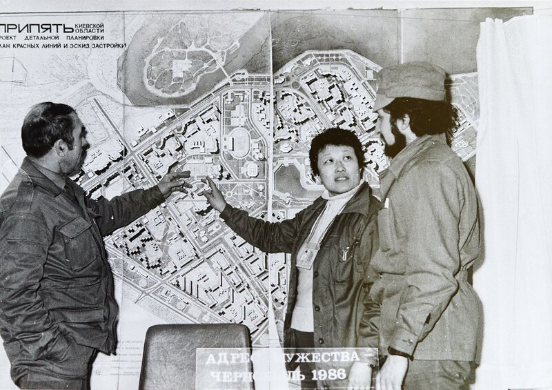 Die Chefarchitektin von Prypjat, Maria Protsenko (2.v.r.), hat die Atomstadt Prypjat geplant. Nach dem Unfall arbeitet sie im Tschernobyl-Krisenstab mit. Sie muss die Strahlungswerte in den Stadtplänen von Prypjat kartieren.