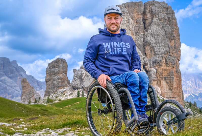 Angelino Zeller (Paraclimbing-Weltmeister) posiert für ein Foto in den Dolomiten bei der Besteigung des Cinqe Torri.
