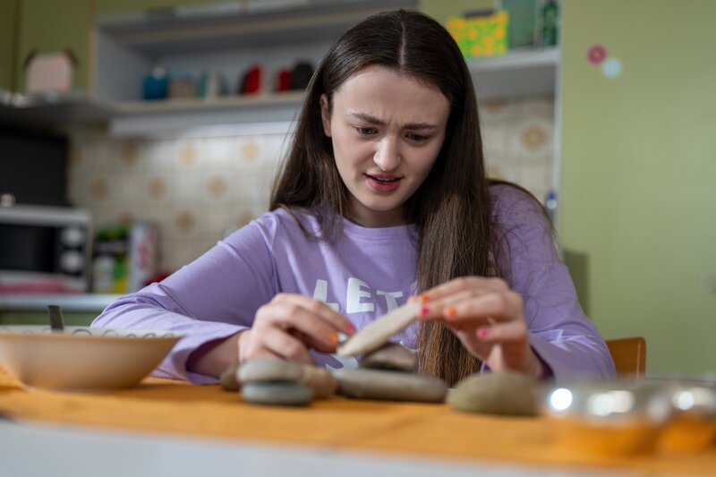 Maja (Godiva Adela) verrennt sich darin, die Kieselsteine korrekt zu stapeln.