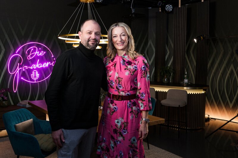 Monika Gruber und Fritz Grampelhuber während ServusTVs „Die Gruaberin - Vodcast“ in Salzburg, Österreich.