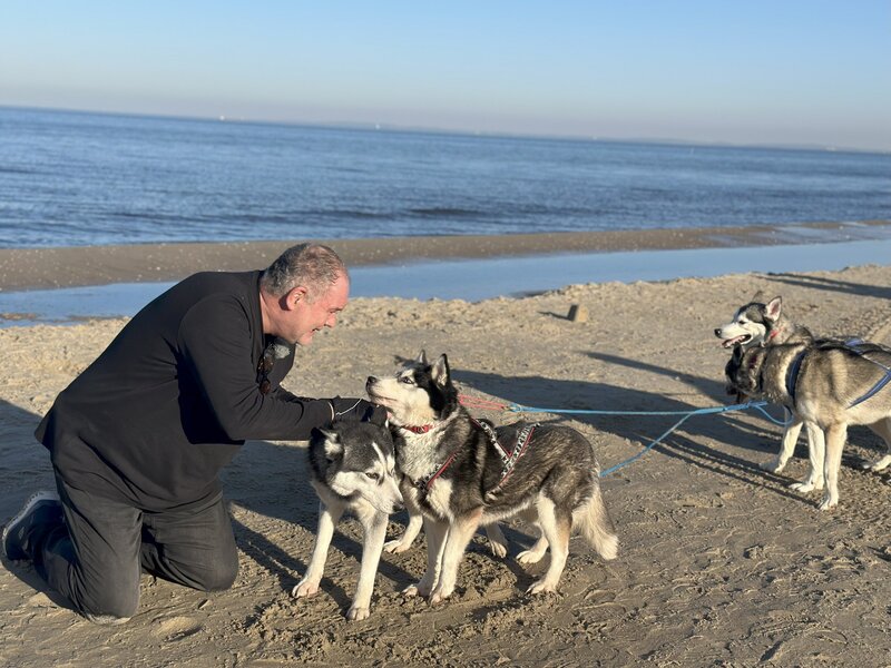 • Waldi am Strand von Usedom mit seinen Schlittenhunden