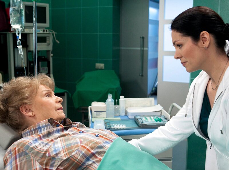 Dr. Elena Eichhorn (Cheryl Shepard, rechts) erklärt Ilse Friedel (Ingeborg Krabbe), dass sie den gebrochenen Oberschenkel operieren müssen. Ilse Friedel macht sich Sorgen um ihre Enkelin, um die sie sich dann nicht kümmern kann, doch schließlich stimmt sie der OP zu.