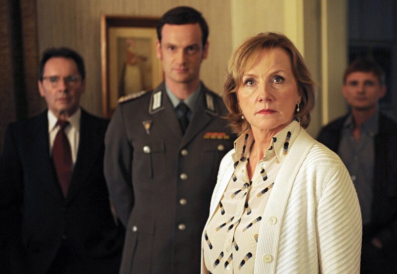 Zum Erstaunen aller singt Dunja bei der Feier im Hause Kupfer ein kritisches, verbotenes Lied. Als Falk dies unterbinden will, besteht Hans darauf, sie bis zu Ende singen zu lassen. v.l.n.r. Hans (Uwe Kockich, l.), Falk (Jörg Hartmann), Marlene (Ruth Reinecke) und Martin (Florian Lukas).