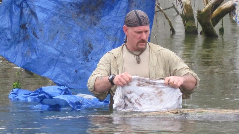 Dave Canterbury wrapping himself in a tarp to stay protected in Dominican Republic.