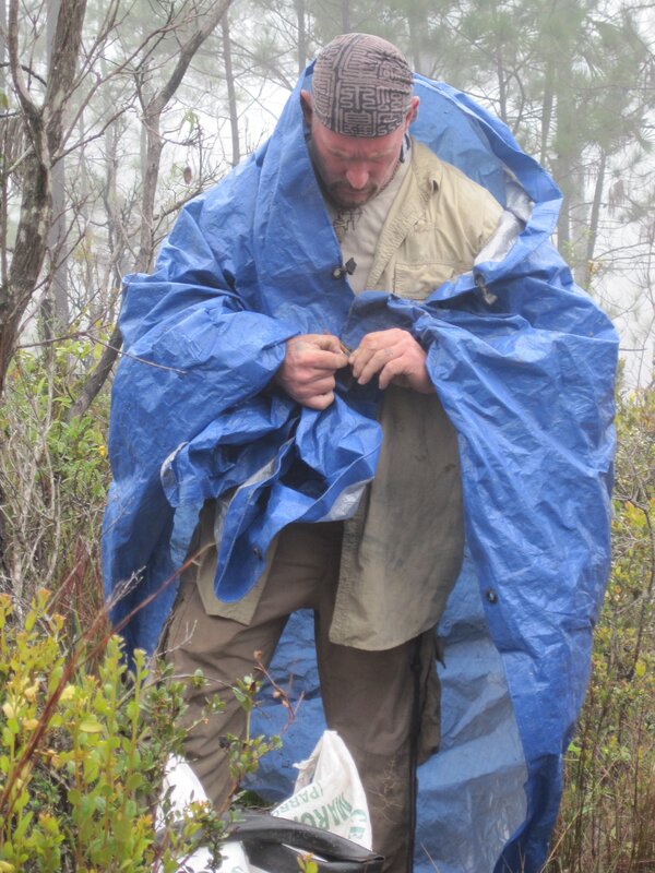 • Dave Canterbury wrapping himself in a tarp to stay protected in Dominican Republic.