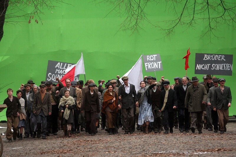 Während der Novemberrevolution von 1918/19 liefern sich Aufständische mit Regierungstruppen und Freikorpssoldaten heftige Gefechte. Dreharbeiten zur Dokumentationsreihe "Die Deutschen II". Folge 9: Rosa Luxemburg und die Freiheit. Der grüne Hintergrund ermöglicht die nachträgliche Bearbeitung am Computer.