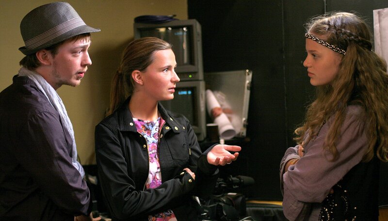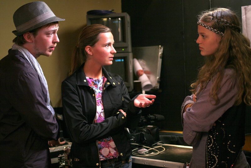 Emma (Sophie Karbjinski, re.) versucht, die belastenden Video-Bilder von den Produzenten (Tino Mews und Zarah Jane McKenzie) der Show zurückzuholen.