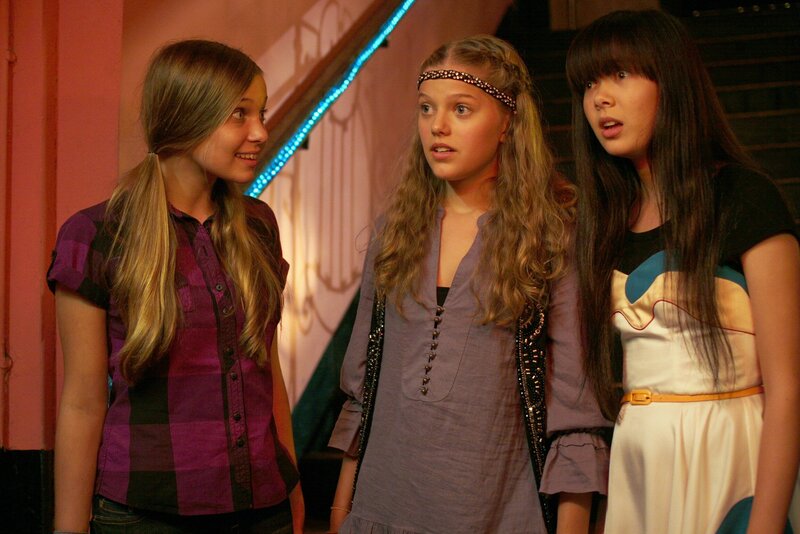 Die drei Mädchen merken, dass sie in Schwierigkeiten stecken, weil der Auftritt ins WorldWideWeb gestellt werden soll. v.li.: Ally (Marny Kennedy), Emma (Sophie Karbjinski), Jackie (Charlotte Nicdao).