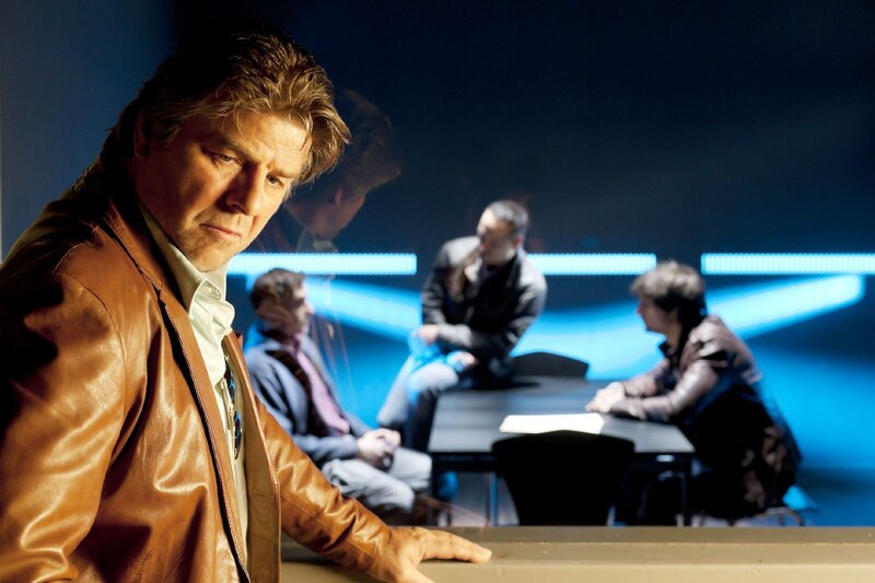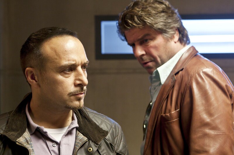Schillinger (Uwe Fellensiek, vorne) sieht seine große Chance gekommen, als Ben (Tom Beck, hinten r.) und Semir (Erdogan Atalay, hinten m.) kein Wort aus dem nur Russisch sprechenden Timoschenko (Mark Zak) rausbekommen: Er bietet sich als Übersetzer an.