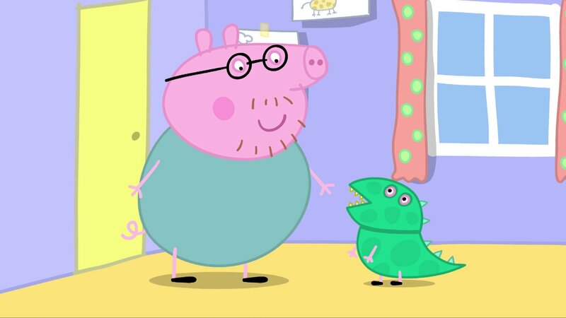 Peppa und Schorsch veranstalten eine Kostümparty und alle ihre Freunde sind dazu eingeladen. Peppa ist als Märchenprinzessin und Schorsch als furchteinflößender Dinosaurier verkleidet.