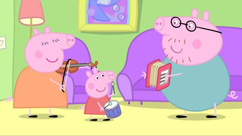 Die nächste Melodie erinnert die Kinder an eine Marschkapelle und kurzerhand haben Peppa (2.v.l.) und Co. Musikinstrumente in der Hand und spielen ihren eigenen Marsch!
