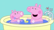 Bald ist Schlafenszeit. Peppa und Schorsch spielen noch draußen, als sie rein gerufen werden, um zu baden. Danach putzen sie sich die Zähne und gehen ins Bett, damit Papa Wutz ihnen eine Geschichte vorlesen kann. Als sie fest eingeschlafen sind, können Mama und Papa Wutz sich endlich von dem langen Tag erholen.