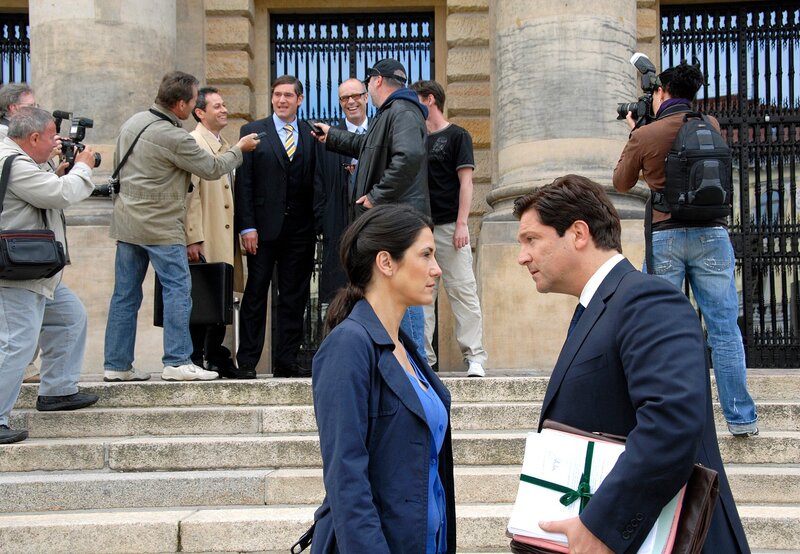• Noch gibt der angeklagte Bürgermeisterkandidat René Tornow (Stephan Szasz, 5.v.li.) sich mit seinen Anwälten Braun (Peter Kremer, 6.v.li.) und Rigas (Vassily Kazakos, 4.v.li.) bei der Presse siegessicher. Sarah (Mariella Ahrens) und Florian (Francis Fulton-Smith) lassen sich davon nicht beeindrucken.