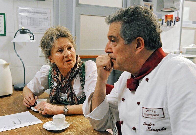 André (Joachim Lätsch, r.) ärgert sich vor Hildegard (Antje Hagen, l.) darüber, dass man Barbara wie immer nichts nachweisen kann.