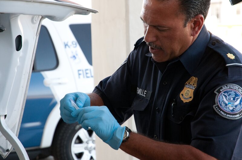 Pharr International Bridge, Pharr Texas USA: CBP Officer Demille tests the drugs which turns out to be positive for Meth. (Photo Credit: NGT/ Kevin Cunningham)