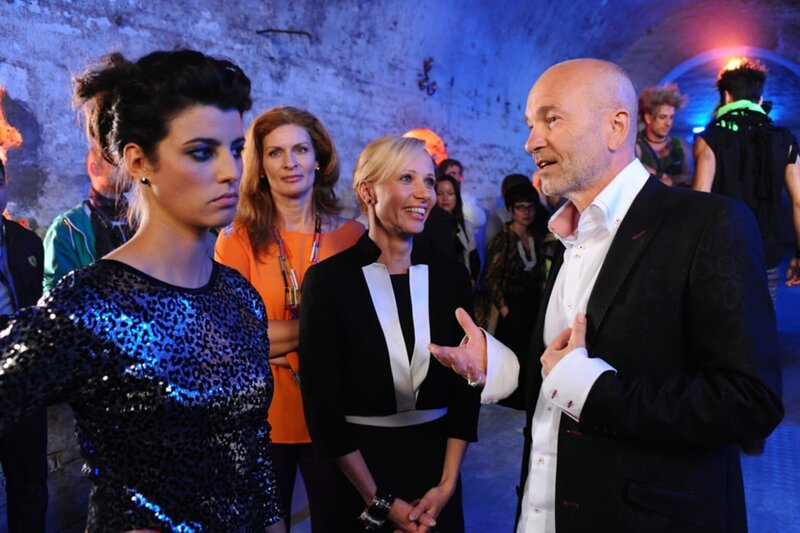 Bruno (Dieter Klebsch, r.) genießt es, Carla (Sarah Mühlhause, l.) zu zeigen, wer der Herr im Ring ist. Natascha (Franziska Matthus, hinten M.) und Florence Garbo (Bettina Ratschew, 2.v.r.) stehen auf seiner Seite.