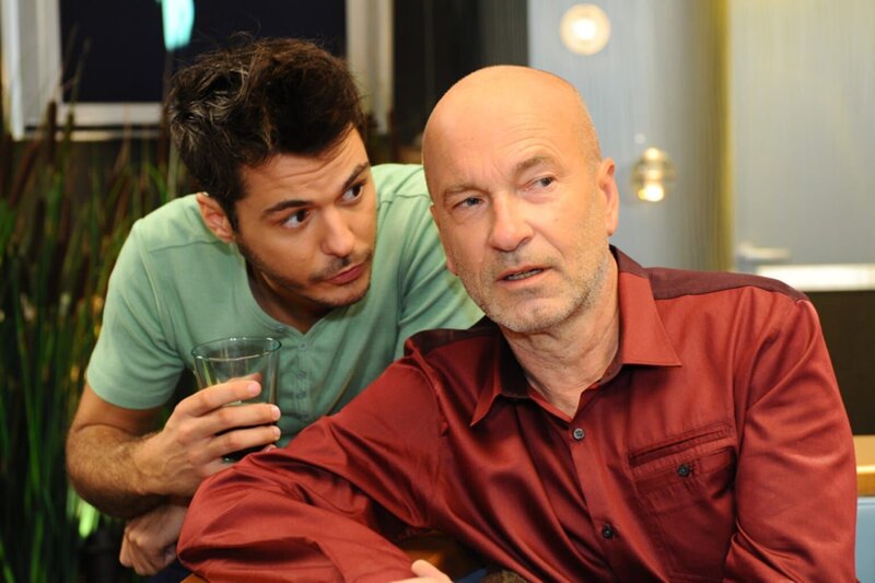 Bruno ist glücklich, Dass Anna und Tom zueinander gefunden haben und Maik (Sebastian König, l.) macht Bruno (Dieter Klebsch, r.) glauben, Jürgen sei Virgins Zwillingsbruder.