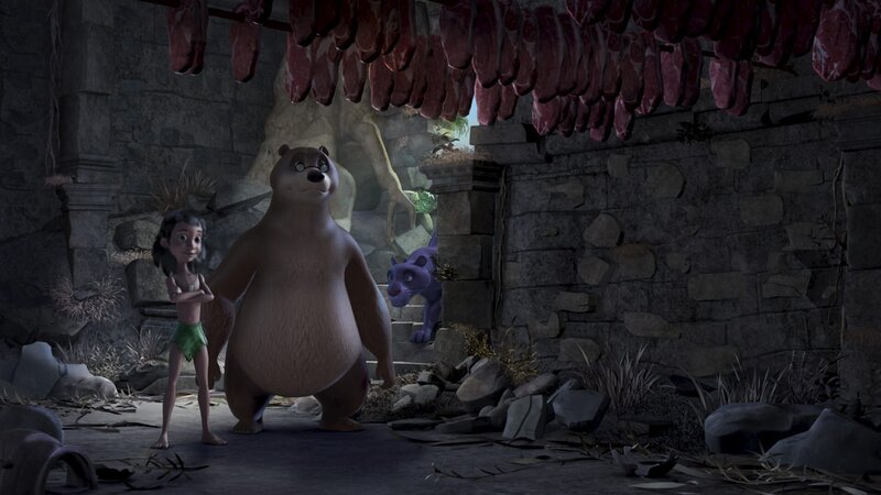Mogli und Baghira zeigen Balu ihren Vorrat an Büffelfleisch. Damit müssen sie eine Zeitlang auskommen.